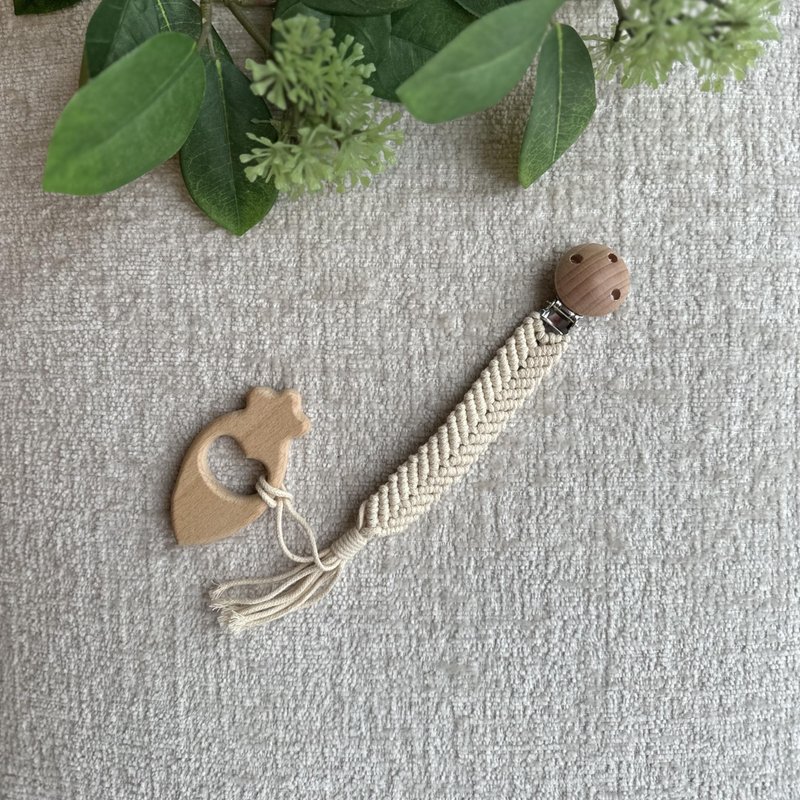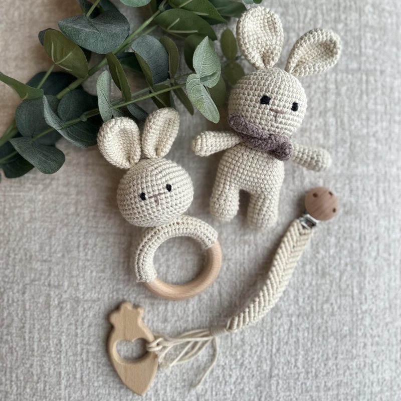 Organic Cotton Handmade Crotchet Bunny Rattle, Toy, teether and Pacifier Holder Baby Shower/Birthday Gift Set., Small, Beige