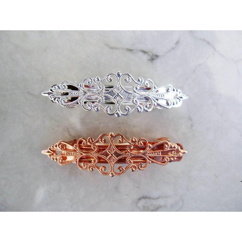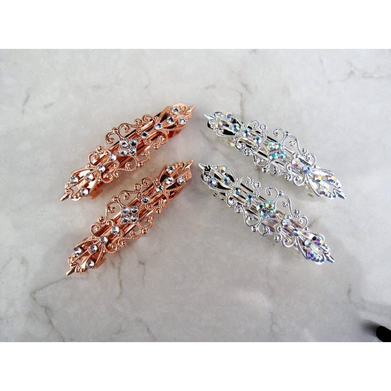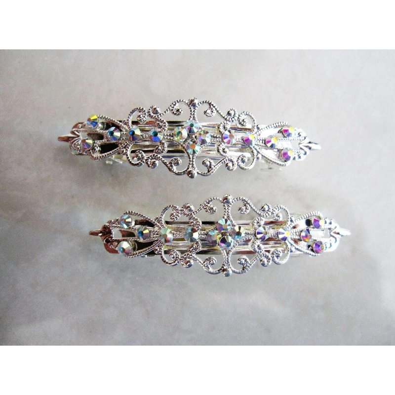 Small silver filigree barrettes with crystals. You get a set of two. Your choice of color and with or without crystals.