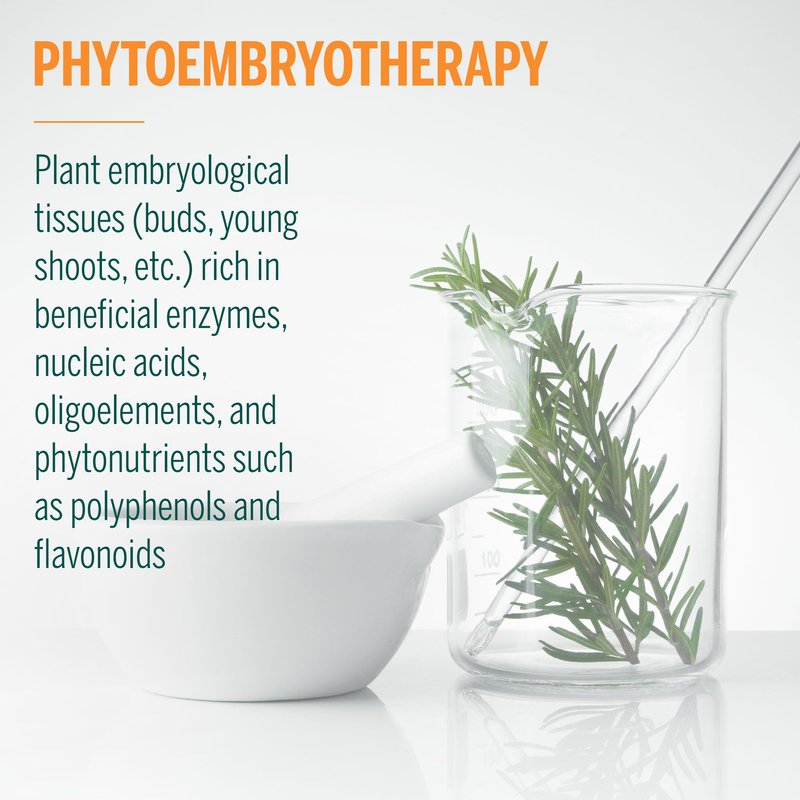 Phytoembryotherapy is a branch of phytotherapy that specifically incorporates plant embryological tissues (buds, young shoots, etc.) containing plant meristem cells, undifferentiated, fast dividing cells which contain the plants genetic blueprint and material. These embryonic tissues are rich in beneficial phyto-chemicals including: enzymes, nucleic acids, oligoelements, and phytonutrients such as polyphenols and flavonoids. These embryological tissues are also utilized because many of the above mentioned components are lost in fully developed plants once chlorophyll is formed. These embryological tissues are also utilized because their energetic components are at their highest levels when they are harvested in the spring the most active phase of the growth cycle.