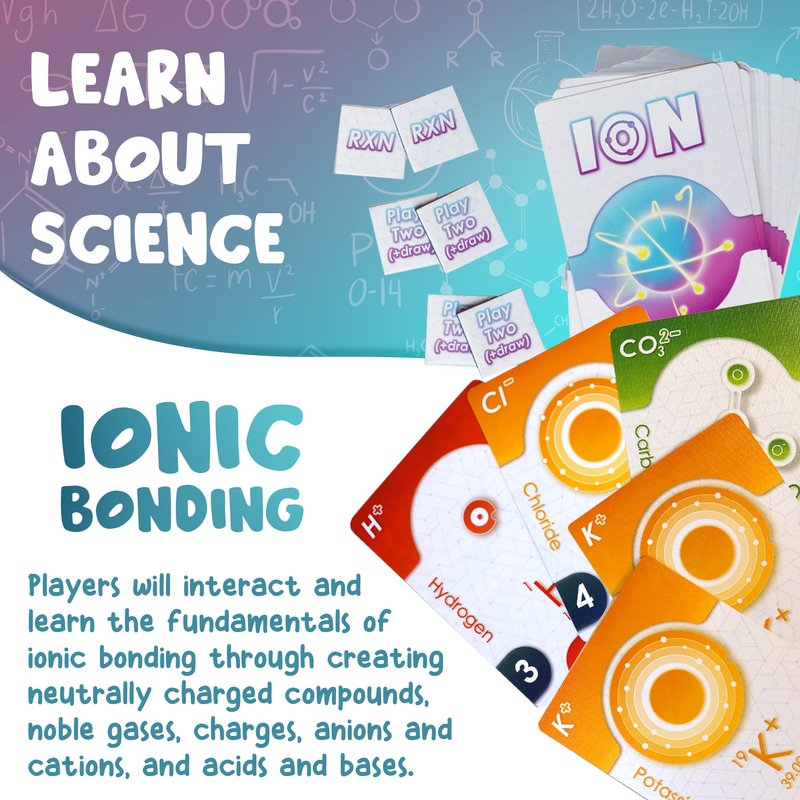 - LEARN SCIENCE: Players will interact and learn the fundamentals of ionic bonding through creating neutrally charged compounds, noble gases, charges, anions and cations, and acids and bases. Science geeks will love playing this game with their classroom, family, and friends in this fast-paced pick-and-pass card game.