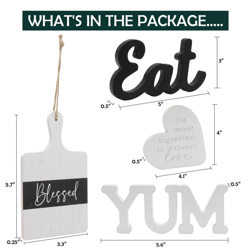 - SIZE REFERENCE: Package includes 4pcs different kitchen signs. Mini Eat Block: 5x3x0.5inch, White Yum block sign:5.6x2.25x0.5inch, Heart Sign:4.1x4x0.5inch, Mini cutting board sign:3.3x5.7x0.25inch.