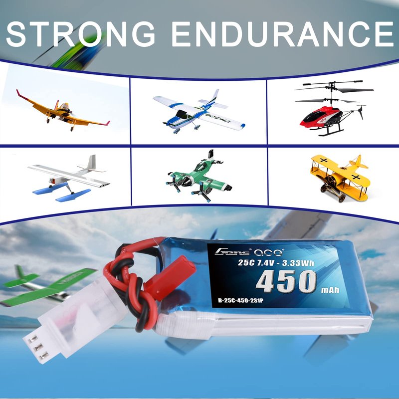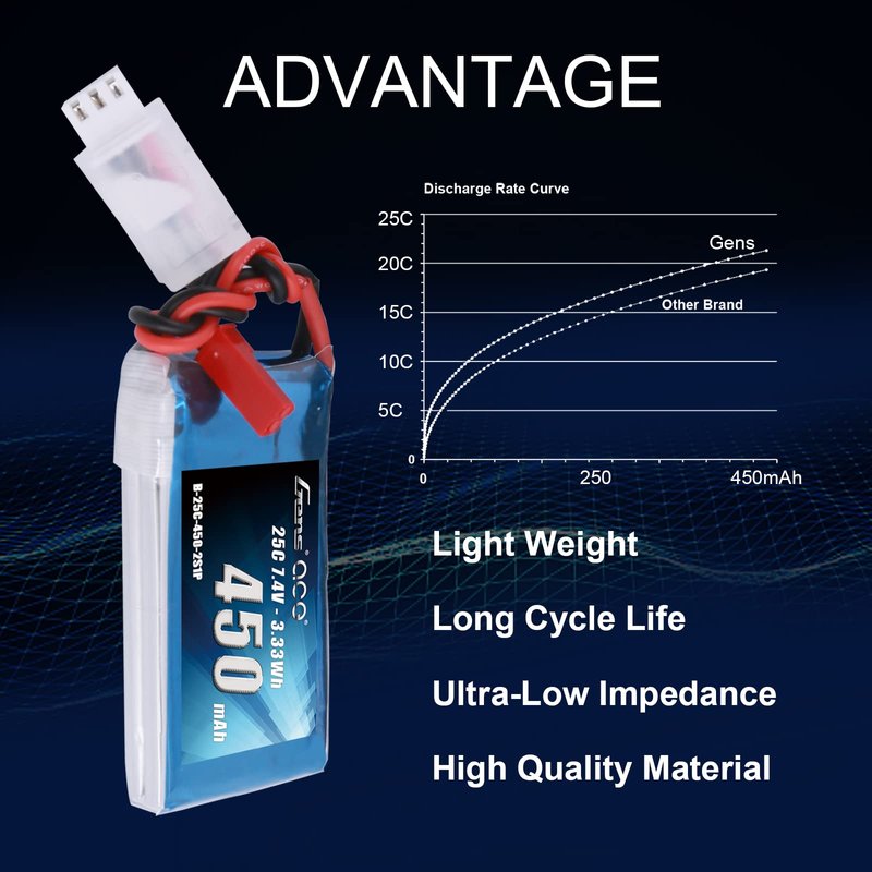 - Gens ace 7.4V 450mAh Lipo battery Specification:Battery Voltage:7.4V;Configuration:2S1P; Capacity:450mAh;Discharge: 25C/50C Plug: JST Plug.