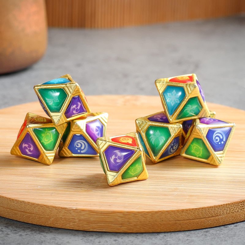 - 【Genius Invokation TCG Dice Set】- Dice with 7 elemental & 1 omni element for Genshin Impact card game. Realistic restoration of in-game props