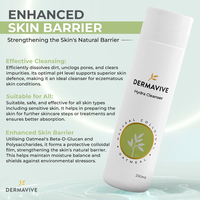 Discover the ultimate skincare experience with Dermavive facial cleanser. This hydrating facial cleanser is designed to maintain your skin’s natural balance while providing a deep, purifying cleanse. Enriched with natural colloidal oatmeal and vitamin E, it gently removes impurities and excess oils without stripping essential moisture, ensuring your skin feels clean, soft, and refreshed. Ideal for all skin types, Dermavive 250 ml hydra cleanser is a non-irritating formula suitable for daily use. This gentle face wash for dry skin is perfect for both men and women, making it a versatile addition to any skincare routine. Its pH-balanced, soap-free and moisturizing properties ensure it meets the highest standards for facial cleansers for dry skin. Whether you're at home or on the go, this cleaner clean face wash supports optimal skin health and a radiant complexion. Embrace a skincare solution that not only cleanses but also nourishes and protects. Our face cleanser is your go-to product for maintaining healthy, vibrant skin every day.