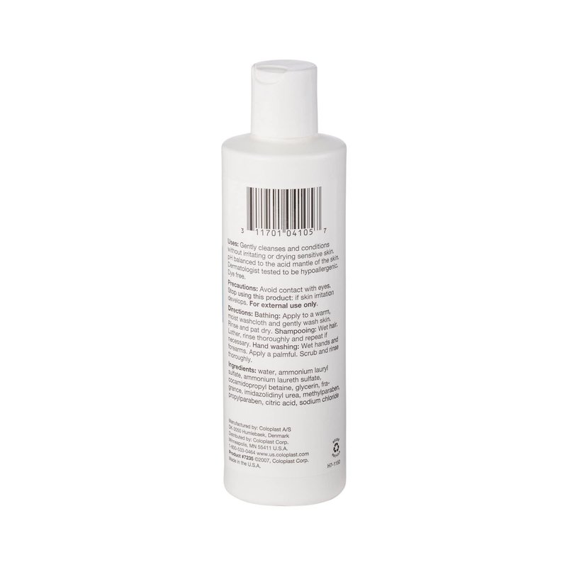 Bathe with Coloplast Gentle Rain Shampoo and Bath Wash as an all-in-one skin and hair cleanser that soothes and cleans without causing irritation. It's hypoallergenic, has a dye-free formula with emollients that helps clean sensitive and fragile skin. Coloplast Gentle Rain extra mild body cleanser also deodorizes while you wash. The gentle soap is dermatologist-tested for delicate skin and hair types.The two-in-one shampoo and body wash easily dispenses from its flip-top bottle for quick application on the body and hands. The cleanser is scented but pH-balanced, which helps prevent scalp flakes and frizzy hair while hydrating the hair and skin. - The Coloplast Gentle Rain extra mild cleanser comforts and cleans the body. It's hypoallergenic as a dye-free formula that includes emollients for bathing sensitive skin. The moisturizing body wash is also a deodorizer for comfortable bathing. The scented soap is dermatologist tested, preventing skin irritation. The two-in-one shampoo and body wash is pH-balanced, hydrating the hair and skin. Its bottle comes with a flip-top for easy use.