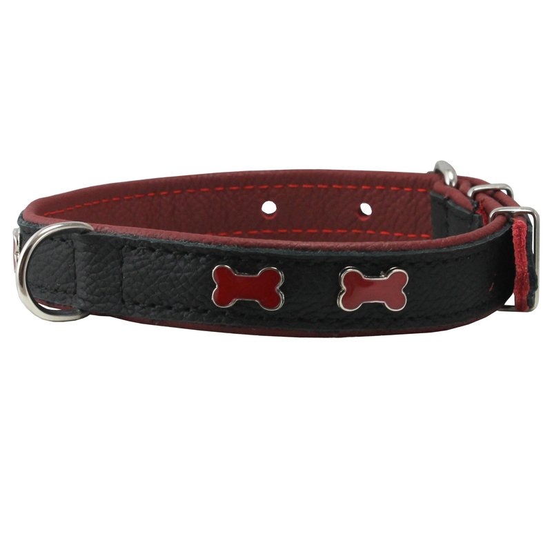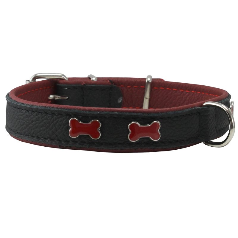 Genuine Black Leather Metal Bone Studs Soft Black Leather Padded Dog Collar 3/4" Wide. Fits 10"-14" Neck.