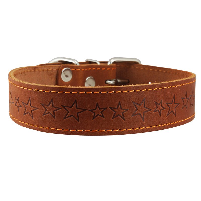 Genuine Leather Dog Collar Stars Pattern Brown 4 Sizes (Neck Circumf: 18"-21"; 1.5" Wide)
