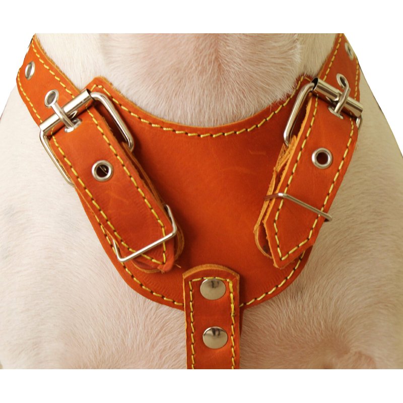 Made of 1" wide genuine leather. Strong and comfortable, wide chest piece designed to equally distribute tension. Trimmed with thick contrast color waxed thread. Best choice for daily walks and training. This size is recommended for Medium breeds, sized to fit 25.5-29 inches chest circumference.