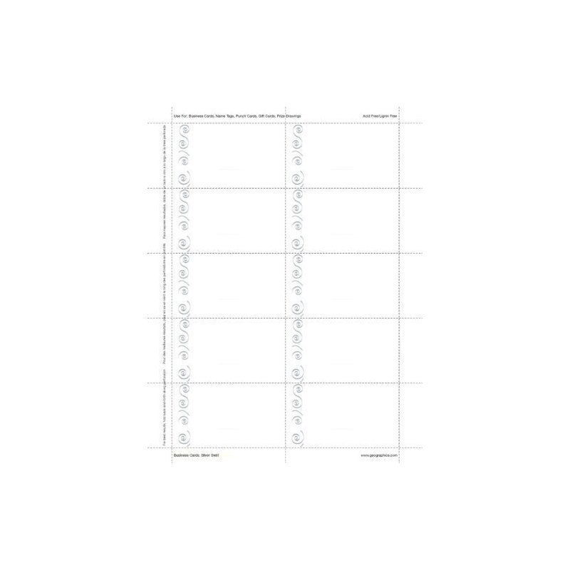 Silver Swirl Business Cards Silver Foil 8.5"x11", 15 Sheets 8.5"x11" 65 lb White Cover Silver Foil Stamped. 10 micro-perforated 2"x3.5" cards per 8.5"x11" sheet. Ultra-fine perforations made for clean card separation. Use for business cards, nametags, change of address notices, product tags, etcInkjet, Laser, Copier. </ul>