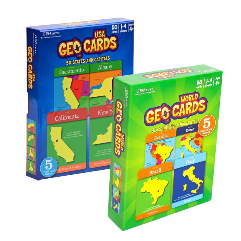 Geotoys GeoCards, World & USA Flash Cards Geography Game, Kid Card Games for Home, School & Travel, States and Capitals Flash Cards, Card Games for Families, Kids Educational Games Ages 4 and Up