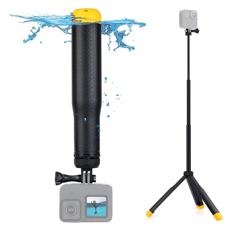- Floating action camera in the water - It can be used as a extendable floating pole or a telescopic floating tripod in the water. You can capture underwater movements without holding the grip. The high visibility yellow cap piece is easy to spot and retrieve in the water.