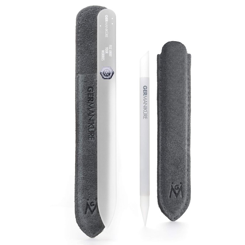 GERMANIKURE Crystal Glass Cuticle Stick & File Away Your Worries Nail File Set in Suede Leather Case – Handmade in Czech Republic – Professional Manicure Supplies – Cuticle Pusher, Callous Remover