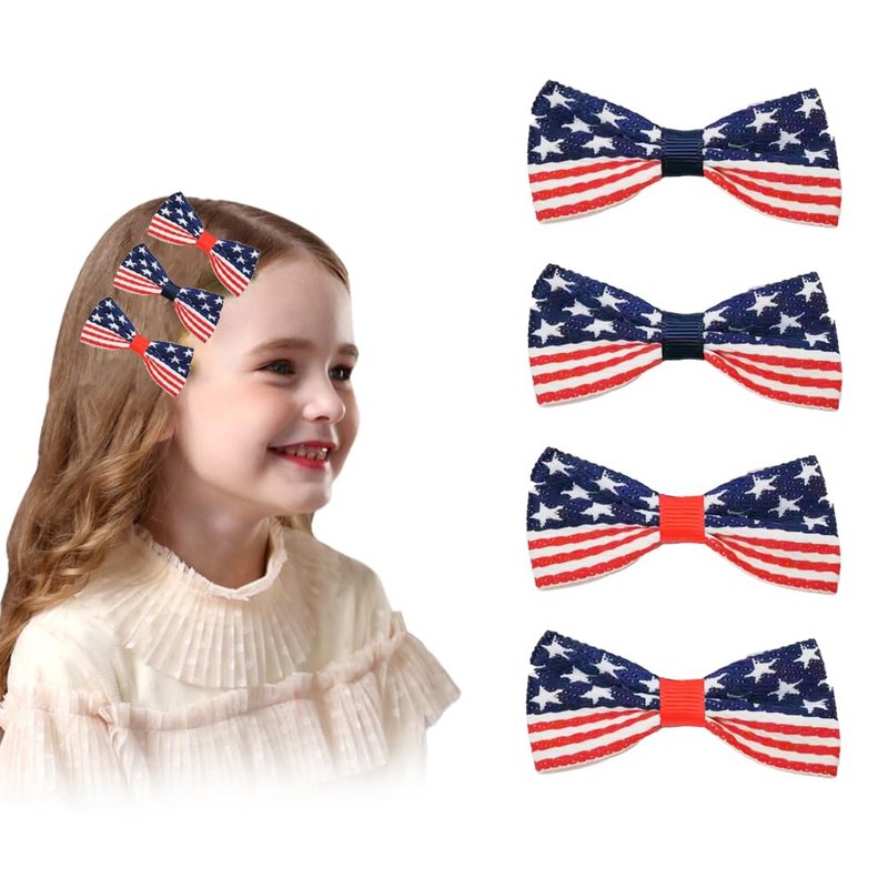 4 Pcs patriotic hair bows American flag hair accessories for women girls blue red white hairpins for Independence Day memorial day Features: Unique and classic design about patriotism, make your patriotic spirit Alligator clip, easy to wear and put off Suitable for many occasions and great gifts for friends, classmates and family Specification: Size: 2.95 x 1.58 inches Color: Red, white and blue Material: Polyester and metal Package Include: 4 x 4th of July hair bow clips