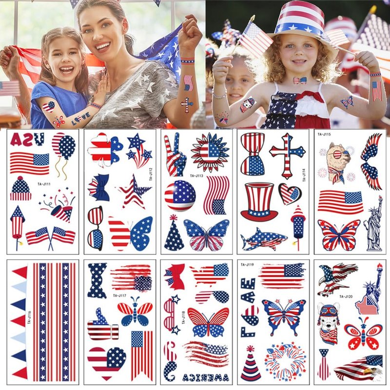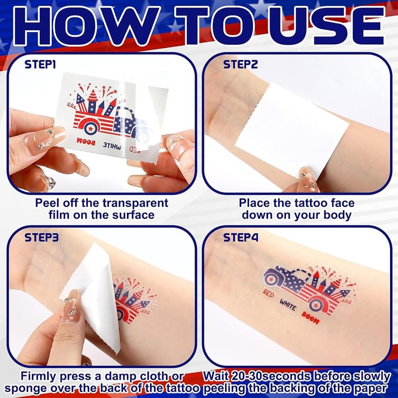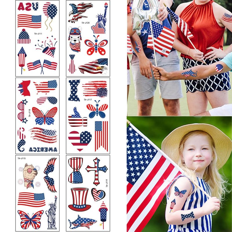 - 【Durable & Long Lasting】The patriotic tattoos have been put through rigorous party testing and long lasting for 3-5 days, but do not rub in the shower. Durable, Waterproof, Removable and Long-Lasting tattoos could make you have a nice day on 4th of July.
