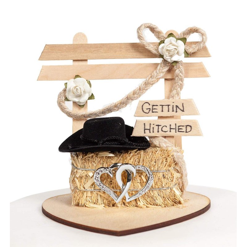 This cute western cake topper features a wooden hitching post with a miniature hay bale and a pair of silver double hearts. Western cake top showcases a wooden heart platform with "Gettin Hitched" décor. Cake Topper Design By Wedding Collectibles