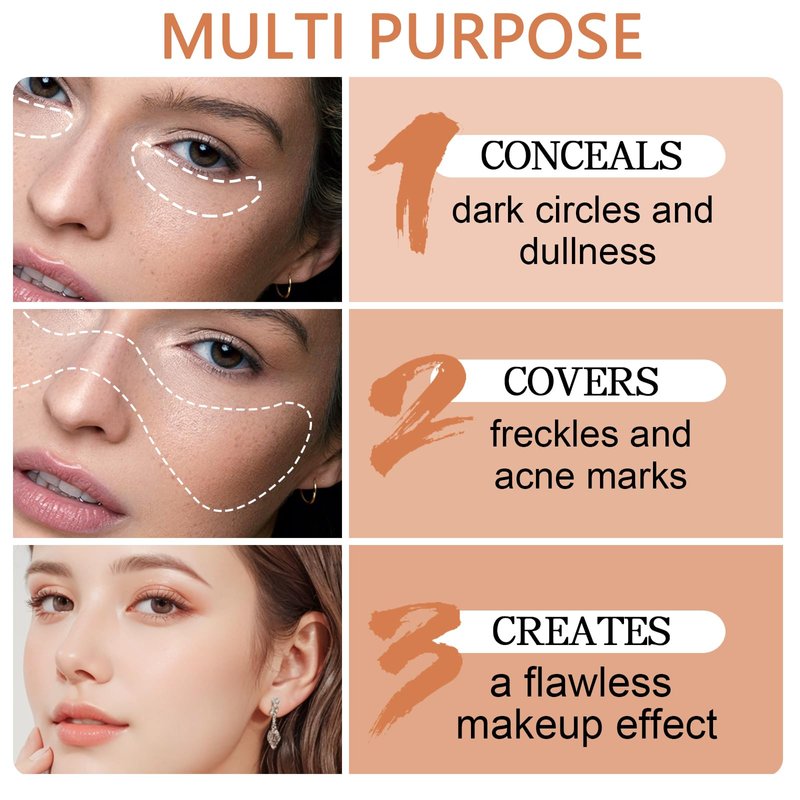 - Full Coverage Concealer: It can cover fine lines, eye bags, dark circles, facial blemishes and other imperfections. Fix redness and dull skin, and restore skin luster.
