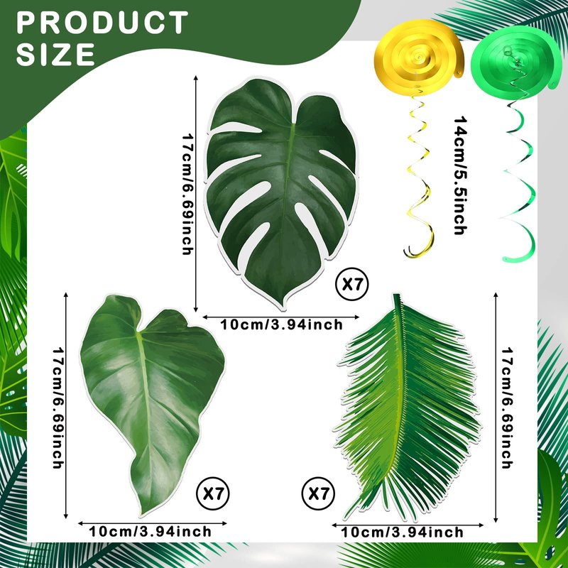 - Quality Material: these palm leaves party decorations are made of quality cardboard, and the size of palm leaves is about 3.94 x 6.69 inches/ 10 x 17 cm, sturdy and reliable, not easy to bend and fade, double sided printing, and the exquisite pattern design will not be out of date; When in contact with light, these hanging swirls will show a shiny effect; The hanging swirl is made of PVC material, which is odorless and strong, not easy to break