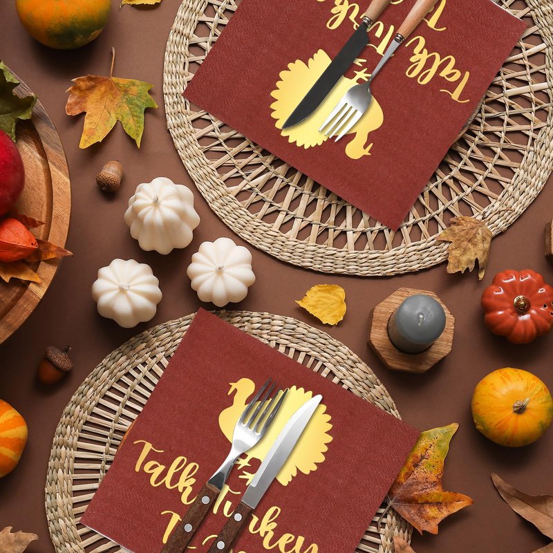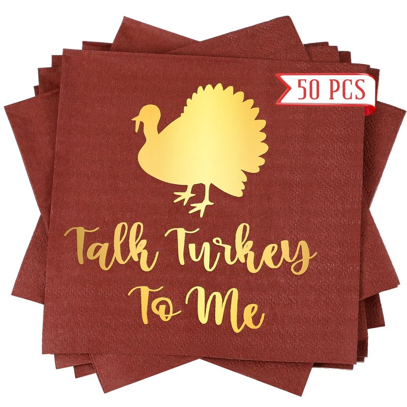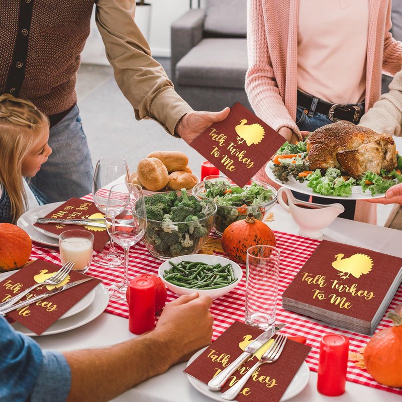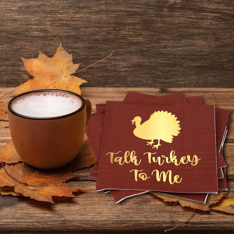 - Talk Turkey to Me Design: our turkey dinner napkins feature a Turkey themed design, complete with gleaming golden foil words saying [ Talk Turkey To Me] ; This delicate design element underscores the gratitude spirit of Thanksgiving, enhancing the festive atmosphere during your celebrations