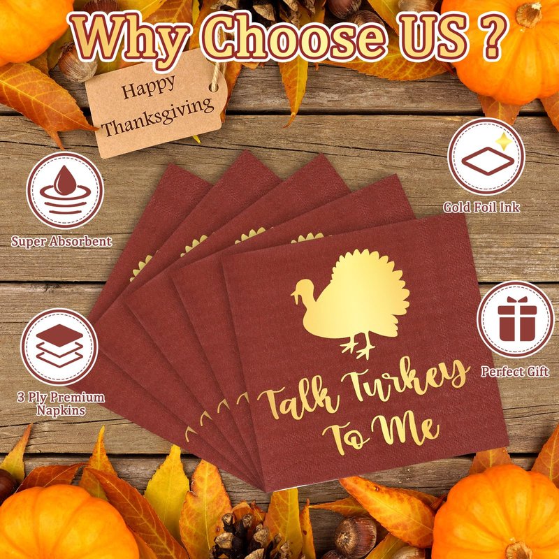 Geyoga 50 Pcs Thanksgiving Napkins 3 Ply Talk Turkey to Me Cocktail Paper Napkins Disposable Gold Foil Thanksgiving Dinner Napkins 5''x 5'' Harvest Napkins for Kitchen Bathroom Party Supplies Decor