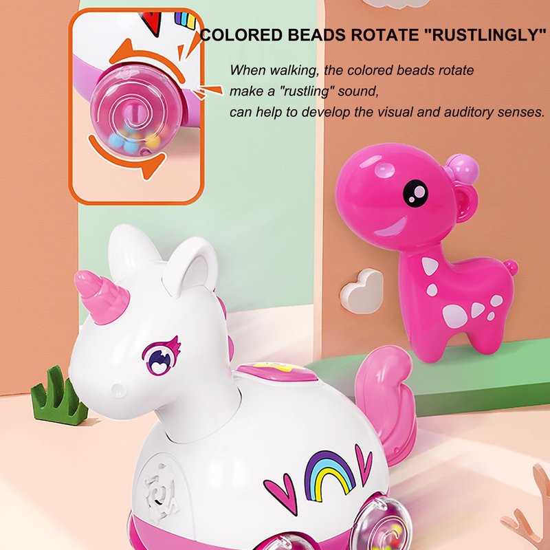 - 【Interactive and Fun Movement】 Our Musical Unicorn Baby Toy features 15 enchanting songs and 15 stimulating sound effects, The unicorn and deer come to life with charming, swaying movements of their heads and tails, providing endless entertainment and laughter for your baby. The toy’s wheels are equipped with colorful beads that create a gentle, soothing rattling sound as they spin, promoting sensory exploration and visual stimulation.