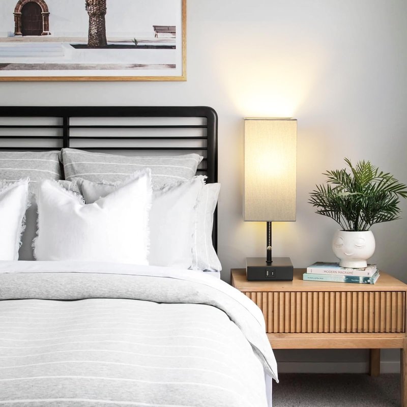 GGOYING Bedside Table Lamp, Modern Nightstand Lamp with USB Charging Ports, Pull Chain, 2700K LED Bulb, Grey Fabric Shade for End Table Living Room Home Office Study Room