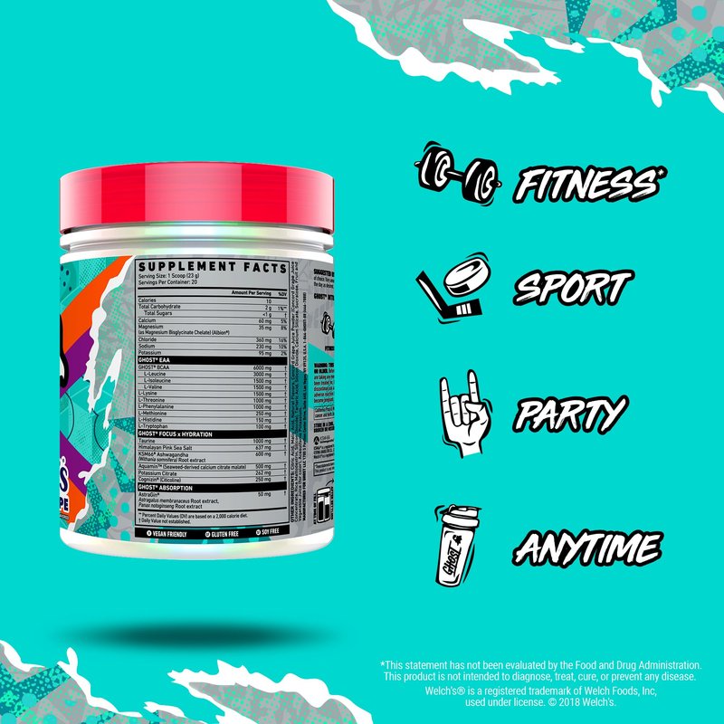 - Classic True to Juice Taste: GHOST Intra combines EAAs, BCAAs, nootropics, and hydration to fuel your body in and out of the gym. Stack it with pretty much anything (like GHOST Size) or use it by itself. Authentic Welch’s “Grape” flavor. 20 servings per container.