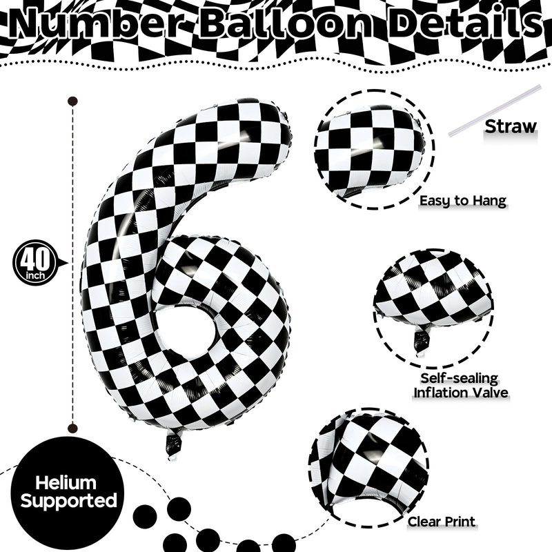 - πΉ Resuable: Big 6 racing balloons can be reusable repeatedly with self-sealing valve, convenient to inflate and deflate by an air. After party ending, the black and white grid of number balloons will easy to deflate and store for next time use. Do not overfill the balloon to avoid sunburn, overheating, sharp objects and excessive friction.