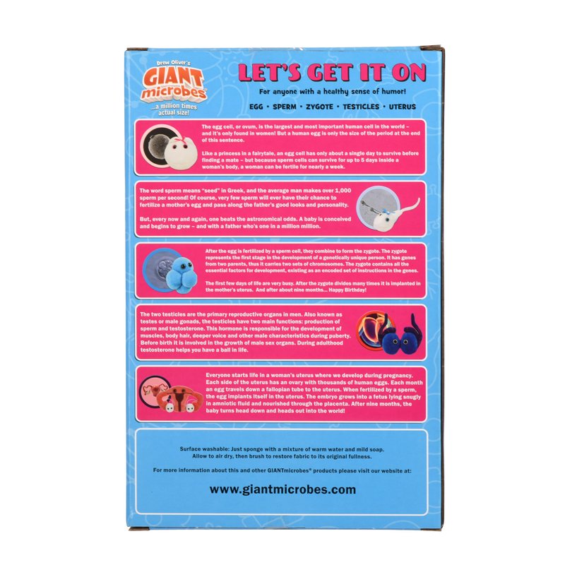 - EDUCATIONAL and ANATOMICAL: Add quirky fun to sex ed with this gag gift! Educational box set includes 3” plush keychains of Egg Cell, Sperm Cell, Uterus, Zygote, and Testicles, with educational info. A memorable way to learn about biology.