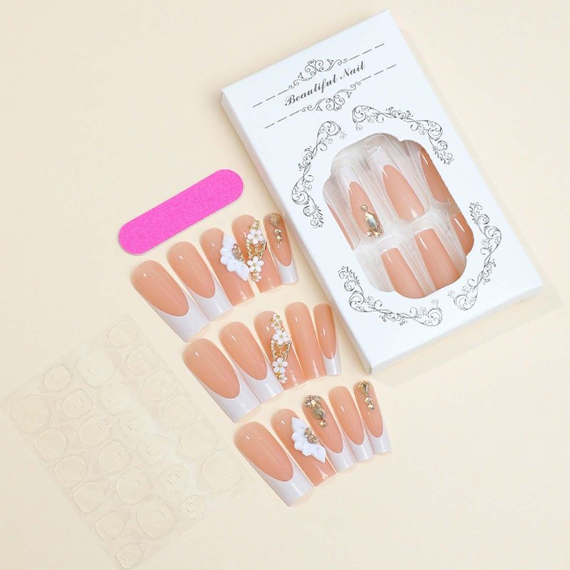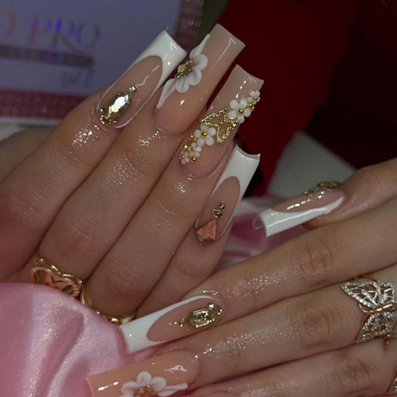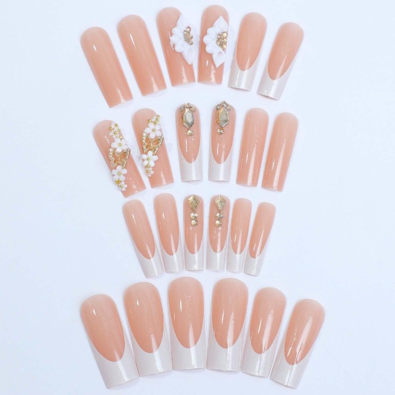 Gifiky Long Square Press on Nails 3D Daisy Butterfly Fake Nails Nude Nails Tips Full Cover French False Nails for Women and Girls 24Pcs