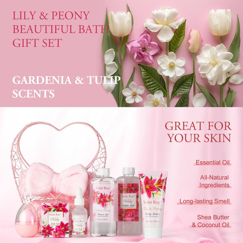 - Lily & Peony Scent Bath Gift Set - Spa Kit Including Body Lotion, Jojoba Essential Oils for Body, Shower Gel, Bubble Bath, Bath Salt, Make-up Sponge Set, Face Wash Headband, Storage Basket for Women. Our Strong Basket Can Be Used In Many Different Ways: Storage, Picnic and Decoration