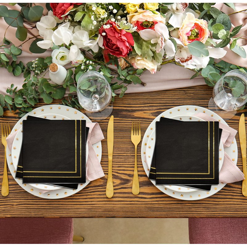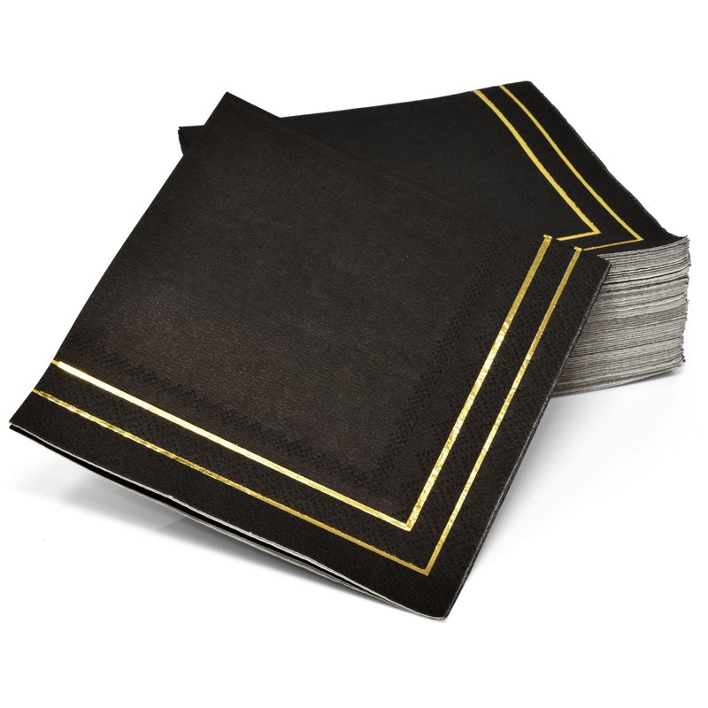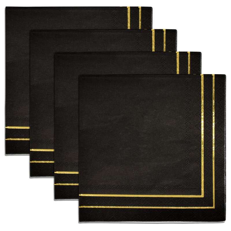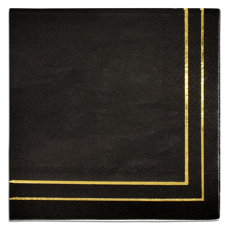 - Gold and Black Cocktail Napkins Serves 100: Gift Boutique square black & gold cocktail napkins features 2 gold foil border lines on a black background. These napkins will definitely enhance your table and impress your guests. Measures: 5" x 5" folded and 10" x 10" unfolded.