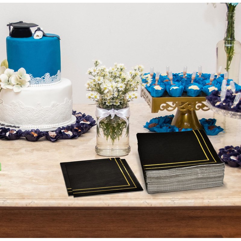 Gold and Black Cocktail Napkins Serves 100: Gift Boutique square black & gold cocktail napkins features 2 gold foil border lines on a black background. These napkins will definitely enhance your table and impress your guests. Measures: 5" x 5" folded and 10" x 10" unfolded. For Gatherings & Special Events: Perfect for 50th anniversaries, birthday parties, tea gatherings, and wine tasting. Flawless napkins for wedding reception, engagement and graduation parties, Christmas dinner, New Years Eve, fancy restaurants, holidays, bridal shower, hearty lunch and more! Treat your guests with all the attention they truly deserve! High Quality: Napkins are made of high quality thick paper. Napkins are soft and absorbent & dry your hands quickly. These gold stripe beverage napkins will be great for any party. The metallic gold foil party napkins really adds dimension to your parties as your guests will love the pretty design. Enough for Your Guest: Stock up with these gold lined dessert napkins so you can be assured that you will have enough for all your guests who will attend your party. Serve dinner to guests in catering, buffet, potluck, events or daily meals. More Time To Enjoy: Disposable paper reduces clean-up time so you can enjoy more time with friends and family. Perfect for your own house or as a gift for a friend. Ideal for dinner table placement, office, party decor, powder room, bathroom vanity, kitchen counter top and guest bathrooms.