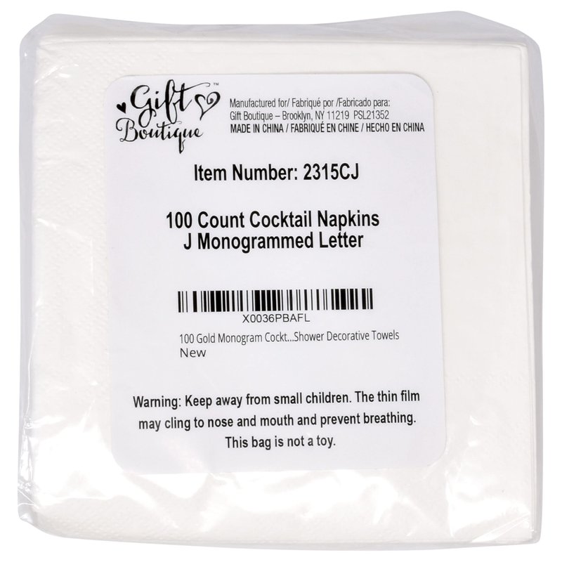 - Monogrammed Cocktail Napkins Serve 100: Gift Boutique square monogram cocktail napkins features the letter J printed in gold foil on white. These napkins will definitely enhance your table and impress your guests. These are essential for providing guests high-end comfort and luxury. Measures: 5" x 5" folded and 10" x 10" unfolded.