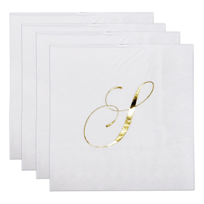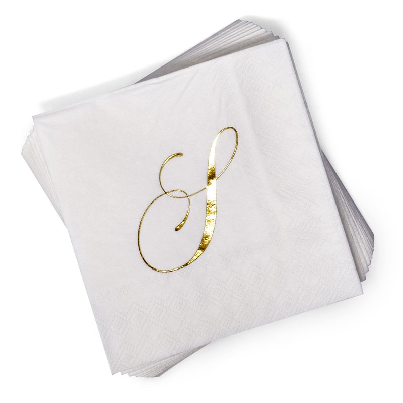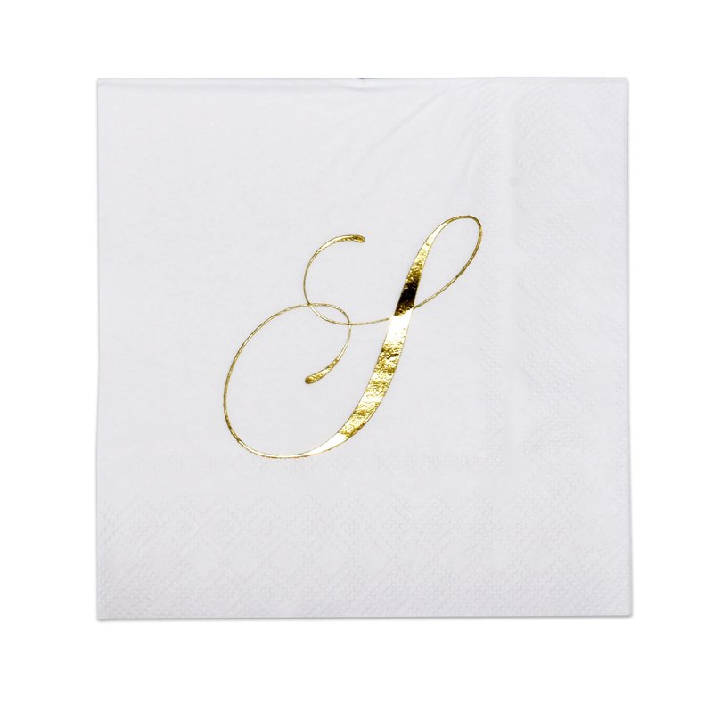 - Monogrammed Cocktail Napkins Serve 100: Gift Boutique square monogram cocktail napkins features the letter S printed in gold foil on white. These napkins will definitely enhance your table and impress your guests. These are essential for providing guests high-end comfort and luxury. Measures: 5" x 5" folded and 10" x 10" unfolded.