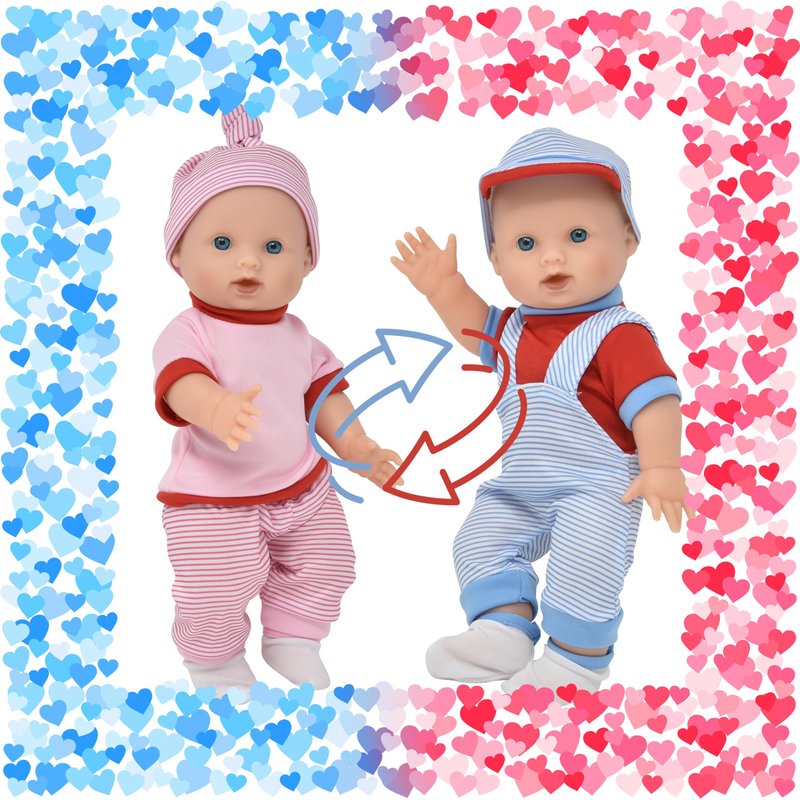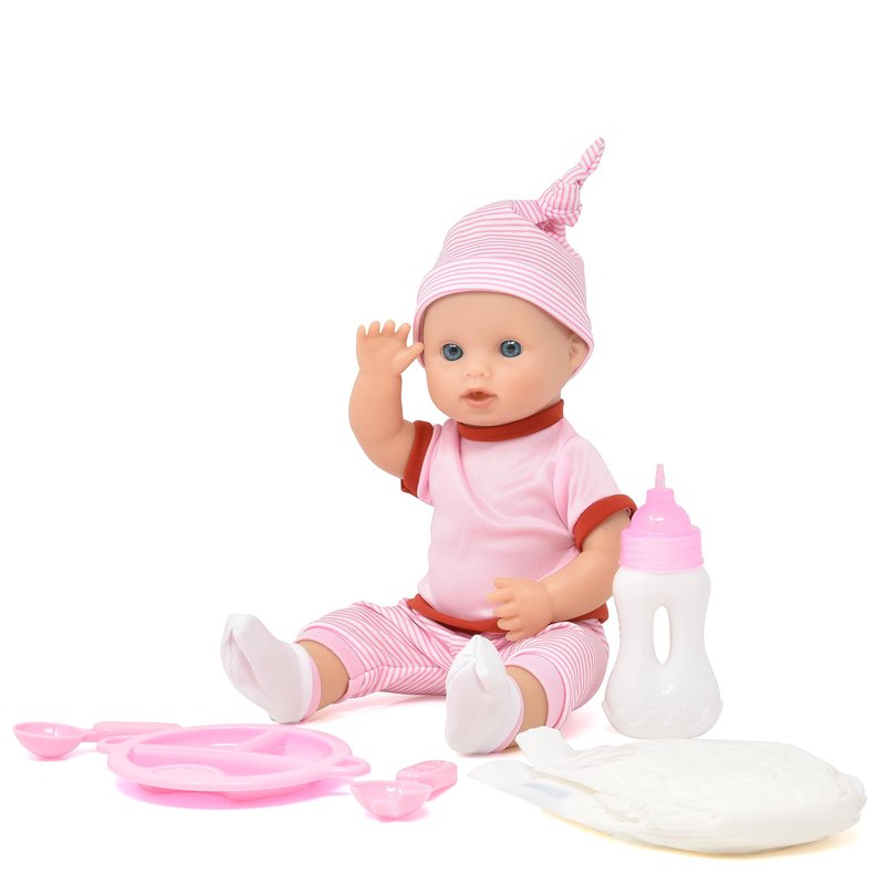 - Baby Doll with Clothes and Accessories - Set includes (1) 12" Baby Doll with (2) sets of outfits, baby bottle, diaper and feeding plate and utensils.