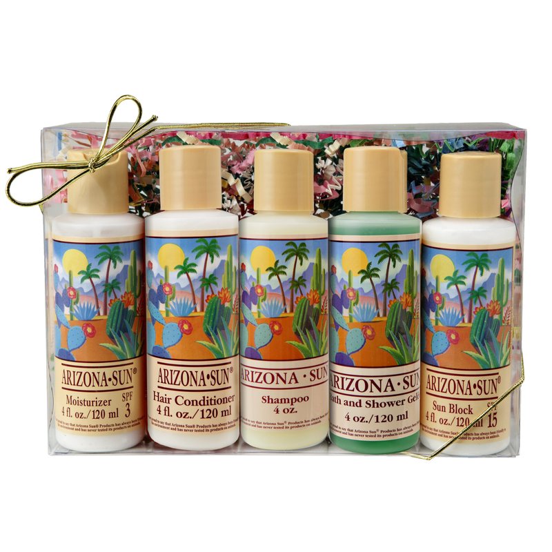 This is our wonderful Bath and Relaxation Gift Set. It comes complete with a 4 oz Moisturizer, Tanning Oil, Shampoo, Hair Conditioner, and Bath and Shower Gelee. It comes beautifully packaged in an acrylic box with colorful fiesta grass and a gold bow. Keep it for yourself, or give it as the perfect gift for any occasion.