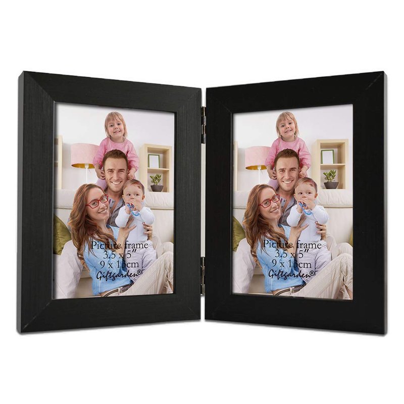 - Elegant Frame: With hinges to hold two vertical 3.5x5 inch photos. This classic black frame will add great personal touch to your favorite faimly photos or pictures of Children.