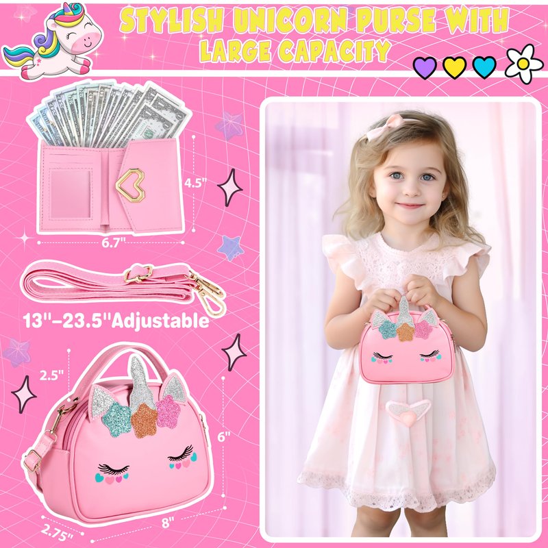 - 【Great Gift Idea for Girls Ages 3 4 5 6 】 Perfect toy for girls 3 4 5 6 years old. Children always imagine that they use the things of adults, these little girl toys can just fulfill their wishes. All fashion accessories look real. This toddler purse is the perfect princess gift for birthdays, holidays, Christmas, and other special occasions. Perfect girls purse for kids 3-5 6-8 4-5. Kids will be ecstatic with this cute unicorn girls purse.