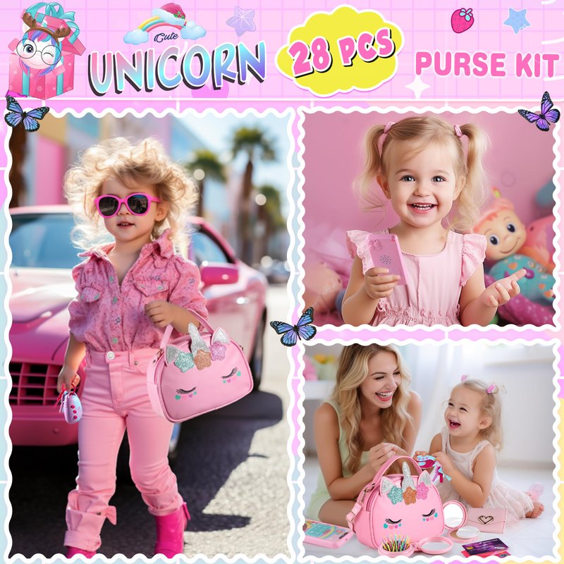 - 【Tollder Purse Toys for Girls 3-8 Years Old】The unicorn girls purse with pretend kids makeup kits and everything a little girl needs. Inside this unicorn purse, she will find a pink wallet, glasses, a cellphone, a unicorn key chain and some pretend makeup kits, like lipstick, face powder, eyeshadow, a car key, credit cards, play money, and a comb. With these pretend toys, children can enjoy the fun of role-playing. Perfect Princess toys for girls 3 4 5 6 7 8 years. It's a perfect gift for girls