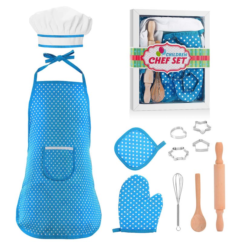 - THE KIDS CHEF SET INCLUDES: Passed CPSIA and ASTM standard tests, this kids apron set include Chef's hat, Apron, Oven mitt, Hot pad, Wooden spoon, Hand mixer, Rolling pin and 4 cookie cutters. These gorgeous little chef starter kit meet cooking and baking needs of the preschool girl & boy baking game.Kids with their own baking tools would be more confident and receptive to career consciousness cultivation