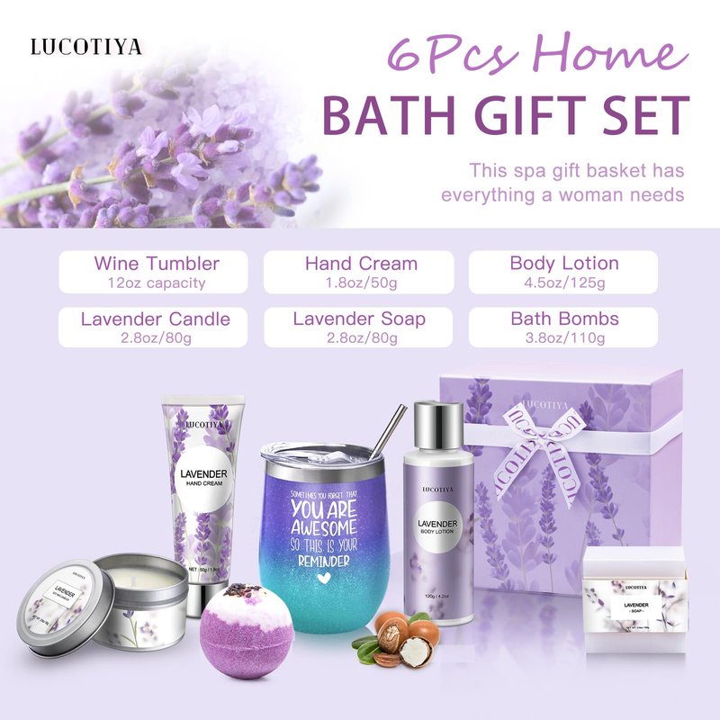 - 6Pcs Home Bath Gift Set for Women: This spa gift basket has everything a woman needs! Each set comes with: Body Lotion 4.2oz/120g , Hand Cream 1.7oz/50g , Lavender Candle 2.8oz/80g , Lavender Soap 2.8oz/80g , Bath Bombs 2.7oz/70g ,Wine Tumbler 12oz . Packed in a stunningly wrapped in a gift box .Our spa baskets are perfectly sized for gift giving.