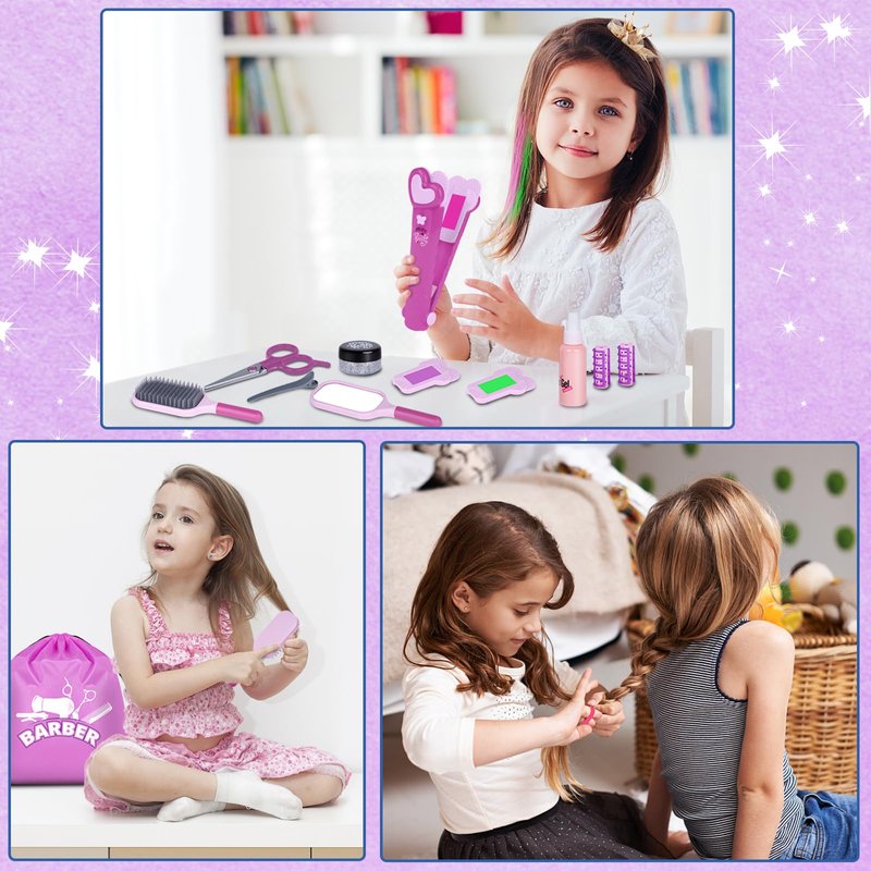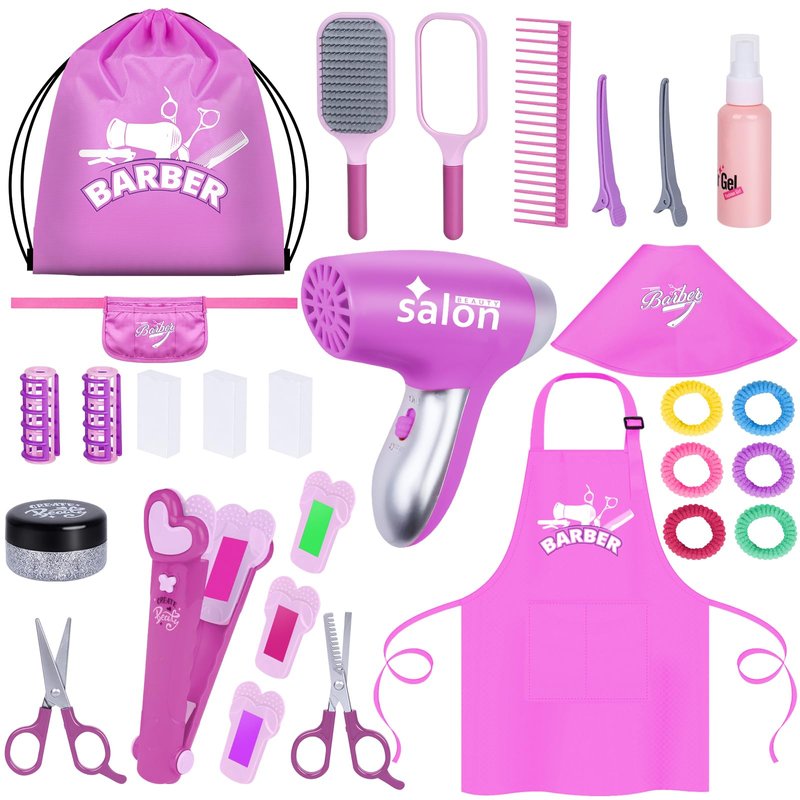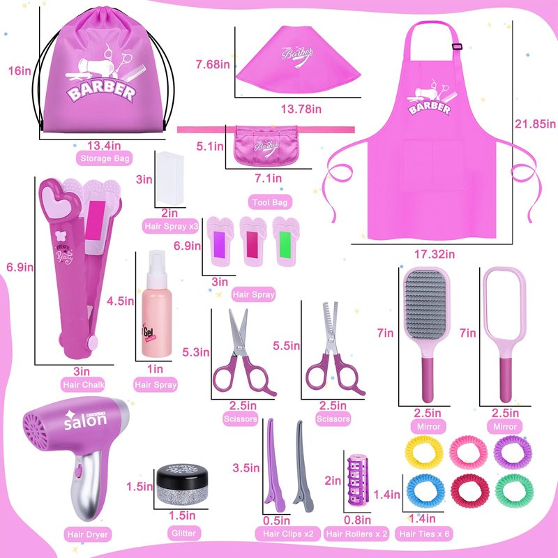 - [Girls Hair Salon Toys] This beauty salon set includes everything girls love about dressing up as a hair stylist like offering hair coloring services! 26pcs salon accessories: Storage Bag, Hair Dryer, Stylist Apron Costume, Shawl, Tool Bag, Comb, Paddle Hair Brush, Hair Spray, Real Hair Chalk in 3 Colors (Pink, Green, Purple), Mirror, Scissors *2, Hair Tie *6, Glitter, Hair Clips *2, Hair Roller *2.