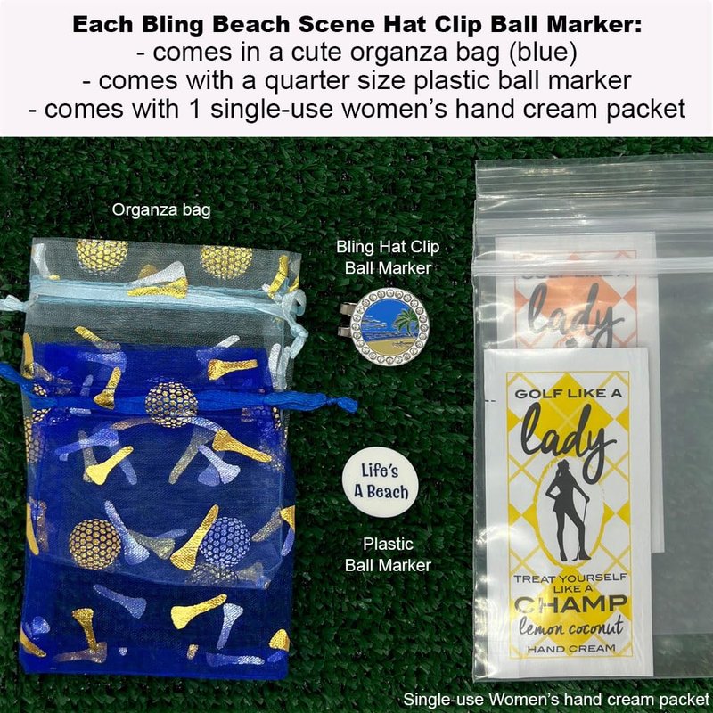 This bright and blingy Beach Scene golf ball marker comes on a magnetic hat clip - ideal for Life's A Beach golf tournaments! The 1"d marker features a beachy scene full of palm trees, sand, ocean and blue sky - perfect for bringing those beach vibes to the course! It's delivered in a cute organza bag, with a quarter-size plastic marker and a packet of women's hand cream.
