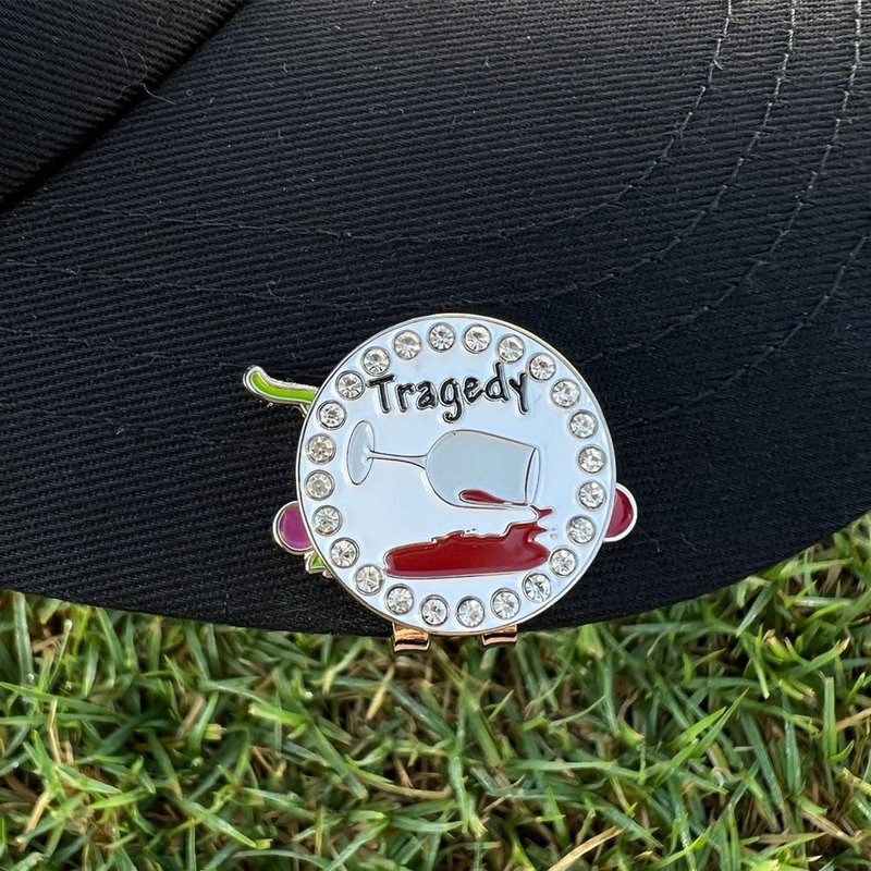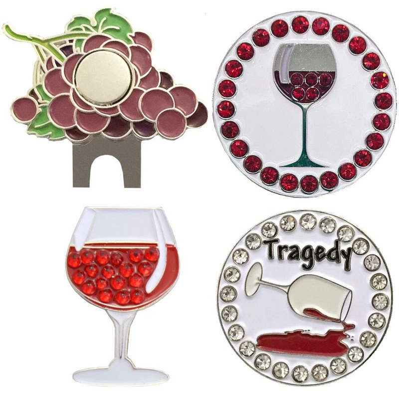 - VINO DESIGN β Includes a magnetic grapes hat clip plus three bling ball markers: a full-bodied cut-out shaped glass of red; a dark red glass of red wine; and a sad spilled glass of red wine (no tears allowed!).