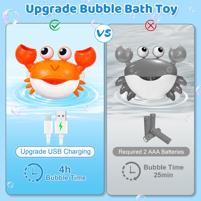 - Rechargeable Bath Bubble Maker 2.0: We've redesigned the 2024 upgraded crab bath toy with rechargeable batteries, a larger container, and easy removing & refilling. Now it can make colorful bubbles for 4 hours which is 4 times that of 3*AAA battery. Save money and keep you from replacing new batteries all the time, let your baby enjoy the bubbles and music, and make toddlers fall in love with bathing
