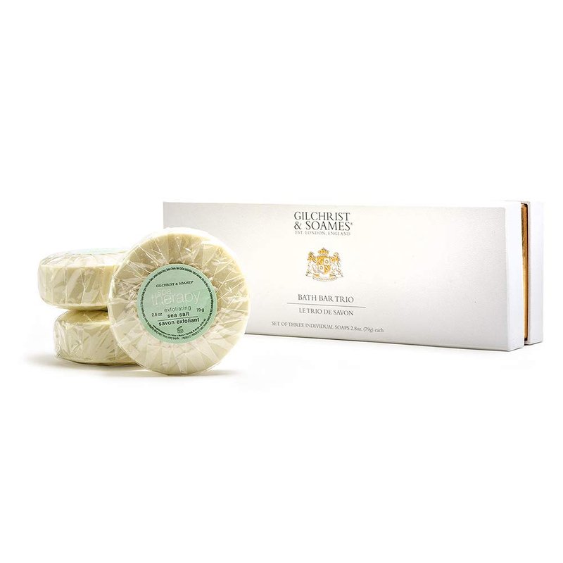 Our Spa Therapy Sea Salt Soaps gently slough away dead surface skin while also providing a moisturizing cleanse and decadent lather. Mineral rich sea salts naturally soften skin, while the fresh, clean fragrance refreshes and renews. Create your own personal spa with this luxurious skin care bar. Set of 3 soaps (2.8oz each) Mineral rich sea salts Fresh, clean fragrance Gently exfoliates Ingredients This Spa Therapy product contains sea salt. A great exfoliant, sea salt sloughs away dead surface skin while bringing nutrients from the sea. Skin is left nourished and clean. The Collection Gilchrist & Soames Spa Therapy collection is designed to reflect a sense of place, taking you on a journey to evoke special memories, emotions, stories and experiences. The collection brings the restorative energy of the sea to skin and hair evoking memories of the Caribbean, Florida�s Gulf Coast or the Hamptons.