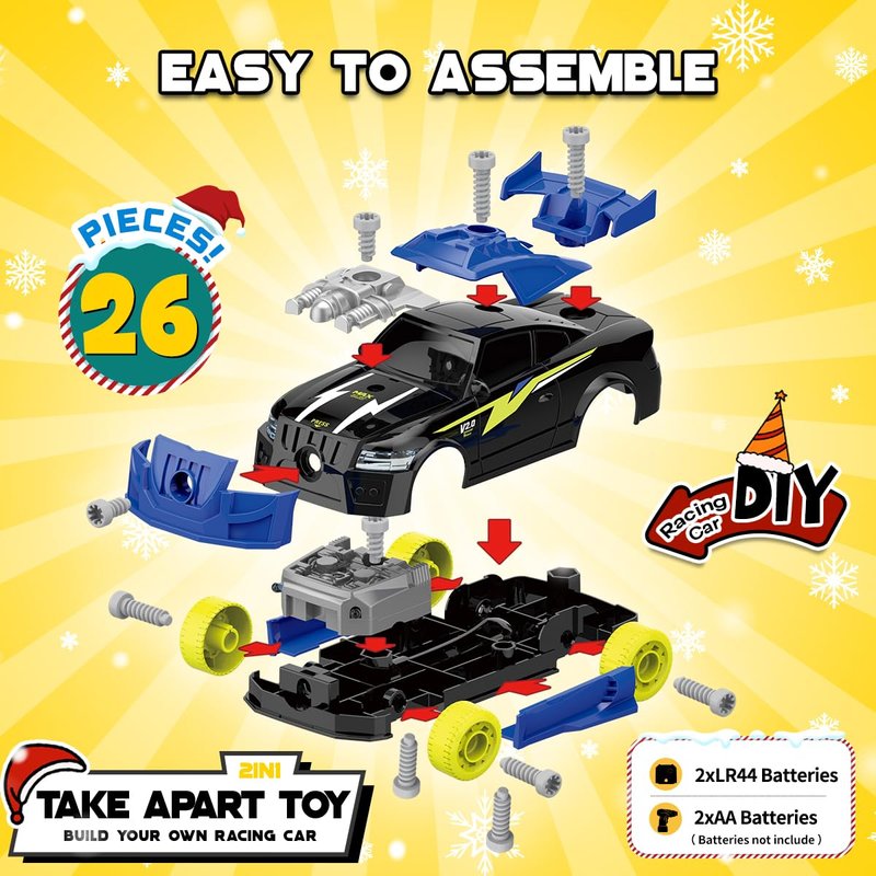 - Young Engineers: The 26 pieces assembly racing car toy comes with drill, tires, screws and car parts, allow kid to assemble, take apart, reassemble, fix and repair, and they can build it on their own hands and then play with it