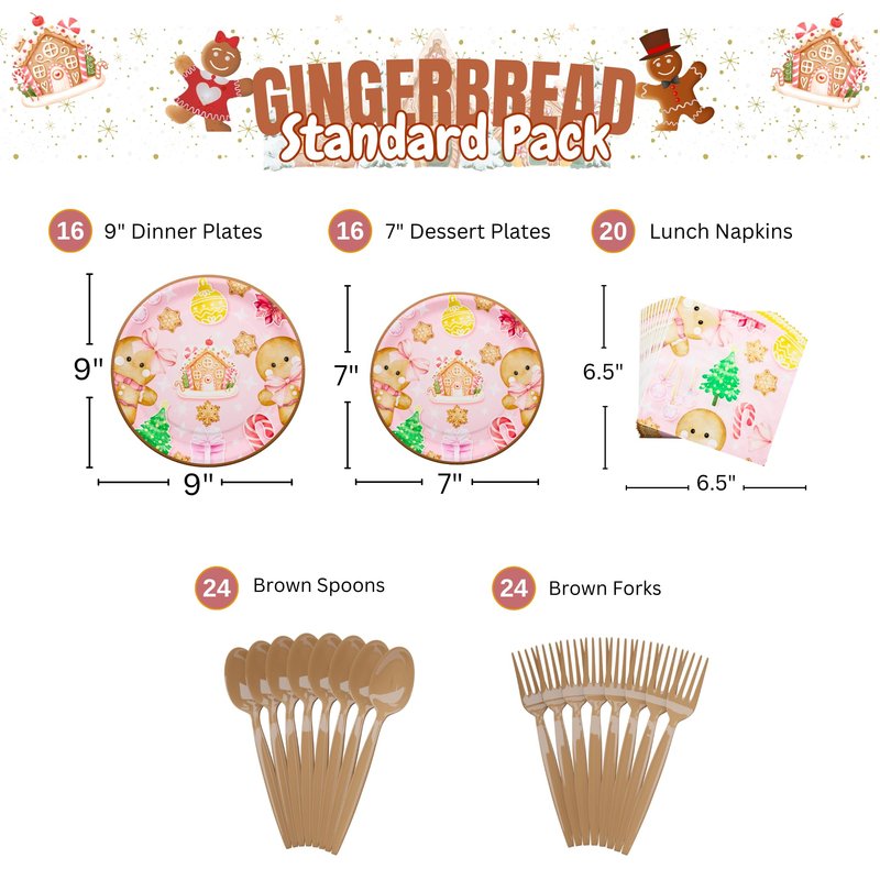 🍪 GINGERBREAD PARTY STANDARD PACK - Includes (16) 9" Dinner Plates, (16) 7" Dessert Plates, (20) Napkins, (24) Brown Spoons, and (24) Brown Forks.