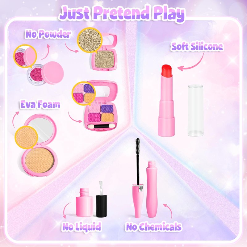 - 【High-Quality & Safe for Kids】GINMIC play makeup set is completely pretended, ASTM and CPC certificated play makeup. It contains no actual cosmetics, chemicals, powders, or liquids. Instead, it's crafted from soft silicone, plastic, and EVA foam. These kids make up kit tools have no sharp edges and are safe for toddlers & kids to play with.Perfect play makeup kit for 3 year olds & up.