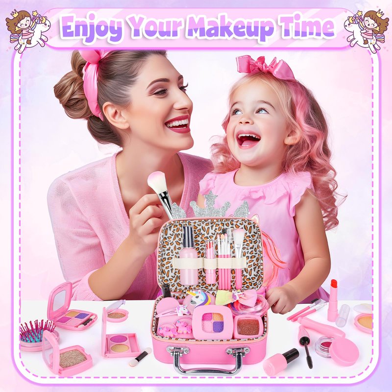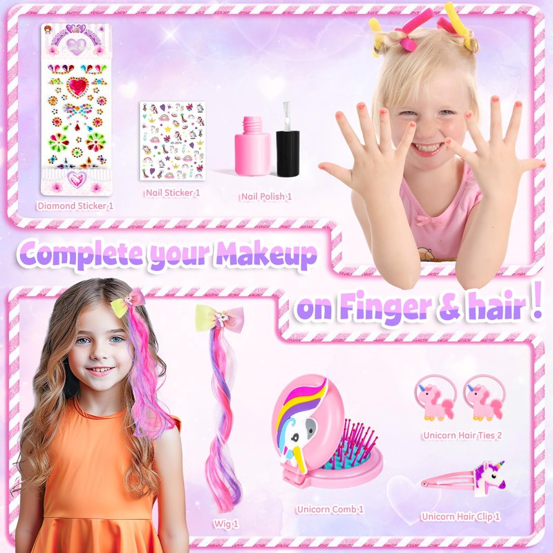 - 【Delicate Unicorn Makeup Bag】Undoubtedly, Unicorns are kids’ support icons. The makeup for kids comes with an attractive pink unicorn makeup bag with silver glitter handles/unicorn details. The ethereal beauty of Unicorns appeals to kids curiosity and imagination.Our kids makeup bag is big enough to keep every pretend play cosmetic organized. Compact in design,this makeup bag is easy for little princess to carry makeup kit wherever she goes.